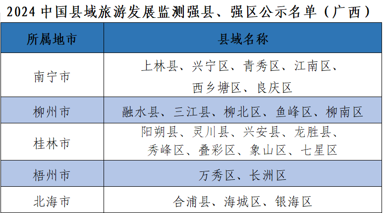 截至2023年底,广西壮族自治区有县级行政单位(含市辖区)111个。其中,县级市10个、县48个、自治县12个、市辖区41个。广西壮族自治区纳入2024(第七届)中国县域旅游发展监测的强县共22个、强区26个 ,占全区总数的43%;公示如下: